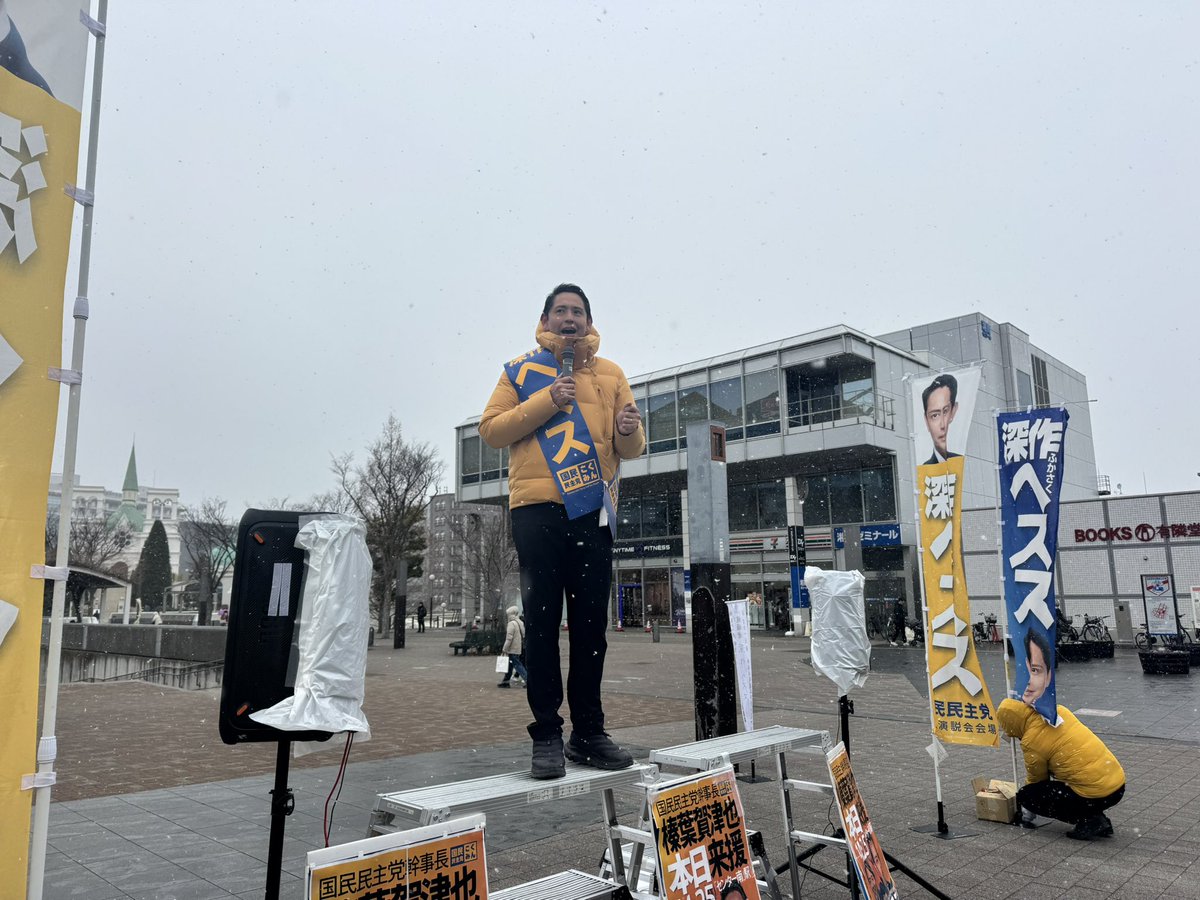 雪が降っています。向かい風も吹いています。それを吹き飛ばすくらい熱く訴えて参ります。14:25から榛葉幹事長との街頭演説会を始めます